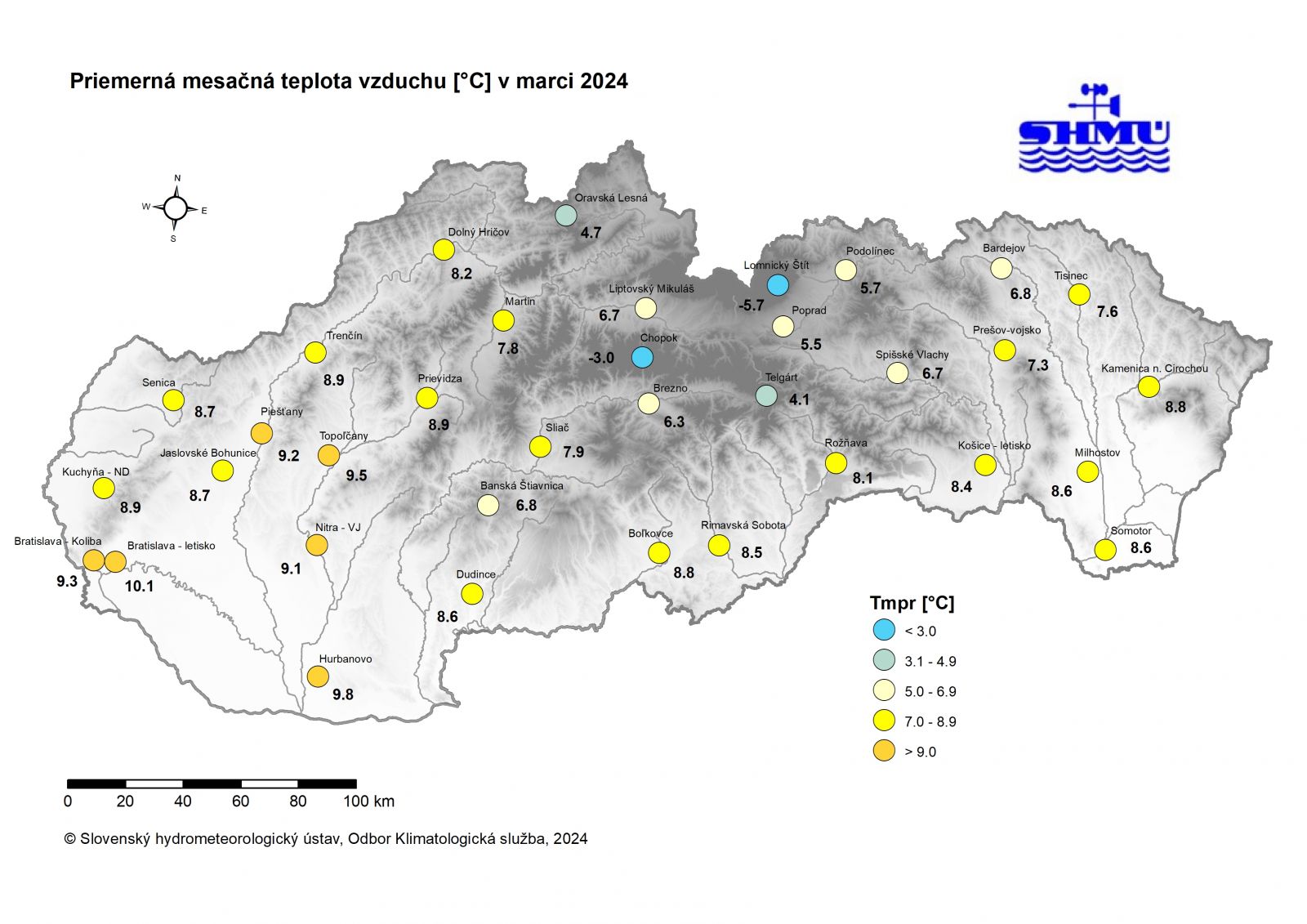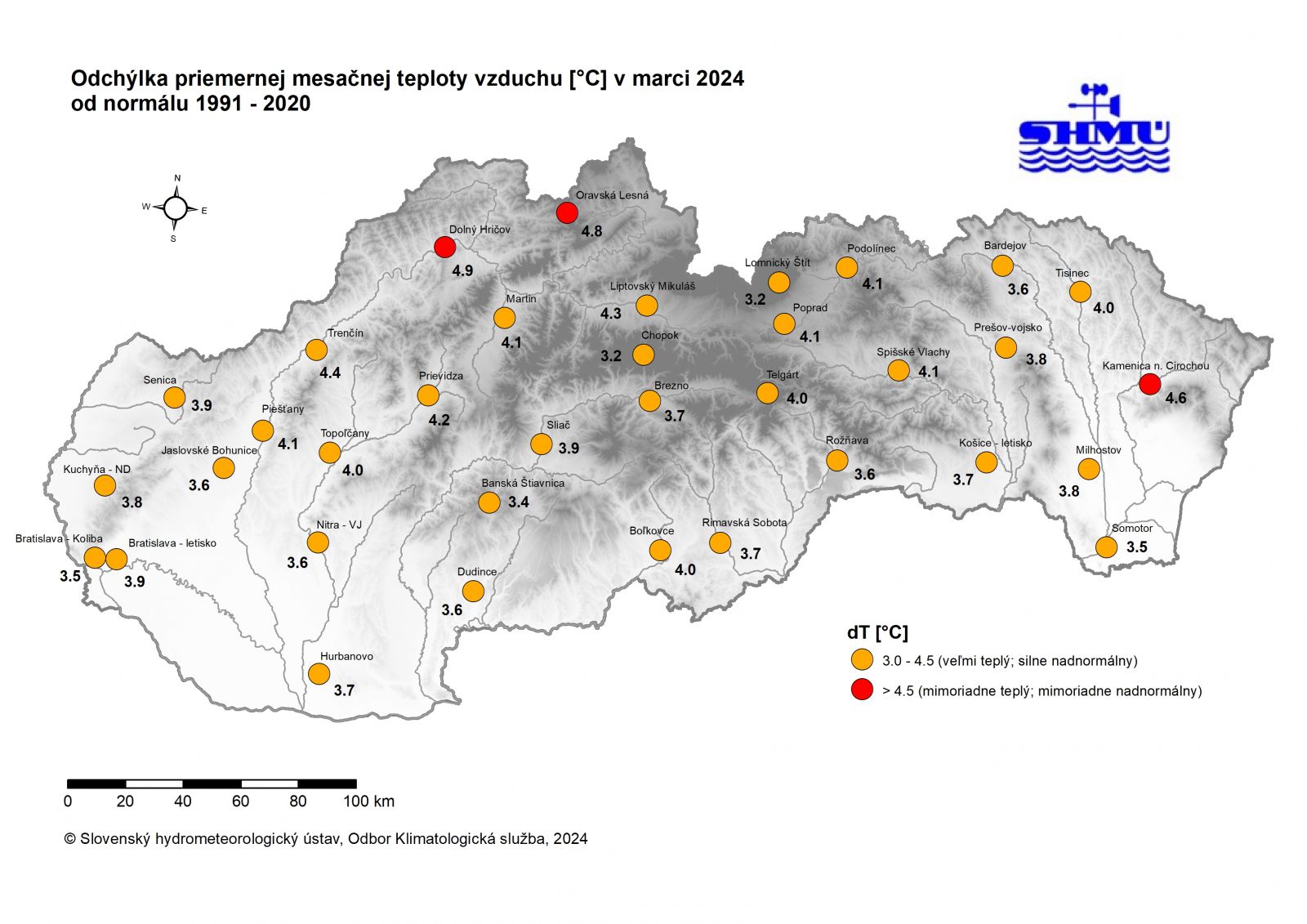 Marec 2024 skončil na Slovensku po teplotnej stránke ako silne nadnormálny (veľmi teplý) až mimoriadne nadnormálny (mimoriadne teplý) a na niektorých miestach až extrémne teplý od začiatku meraní. V Hurbanove to bol najteplejší marec od roku 1872. Najvyššia odchýlka priemernej mesačnej teploty vzduchu od normálu 1991 – 2020 bola 4,9 °C v Dolnom Hričove. Najnižšia odchýlka teploty vzduchu bola 3,2 °C na Chopku a Lomnickom štíte. Najvyššia priemerná mesačná teplota vzduchu bola 10,1 °C v Bratislave – letisku. Najnižšia priemerná mesačná teplota vzduchu bola 3,9 °C v obci Stratená. Absolútne najnižšia teplota vzduchu do 1000 m n. m. bola nameraná 20.3. v obci Huty -7,8 °C (na Lomnickom štíte to bolo -16,3 °C dňa 19.3.). Absolútne najvyššia teplota vzduchu bola 25,6 °C, nameraná dňa 30.3. v obci Leles. Letný deň bol v marci aj na staniciach Veľké Trakany 25,5 °C, Somotor 25,1 °C a Vysoká nad Uhom 25,4 °C.