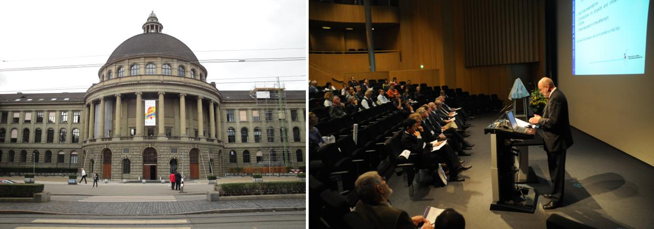 Obr. 1 Budova Švajčiarskeho národneho inštitútu pre technológie (ETH) v Zürichu - miesto konania Európskej konferencie aplikovanej klimatológie - ECAC 2010 (vľavo); slávnostné otvorenie konferencie EMS/ECAC 2010 v pondelok, 13. septembra 2010 (vpravo; Foto: http://www.ems2010.ch/gallery2/main.php)