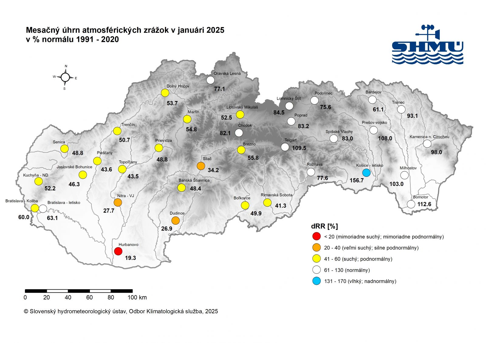 Január 2025 bol na väčšine územia Slovenska zrážkovo mimoriadne podnormálny (mimoriadne suchý) až nadnormálny (vlhký). Percento normálu 1991 - 2020 mesačného úhrnu zrážok bolo najvyššie 156,7 % v Košiciach a najnižšie 19,3 % v Hurbanove. Najnižší mesačný úhrn zrážok sme namerali v Kolárove 6,1 mm. Veľmi nízke úhrny hlásili aj meteorologické stanice Želiezovce 6,5 mm, Hurbanovo a Žihárec 6,6 mm, Veľké Lovce a Mužla 6,8 mm, Farná a Gbelce 6,9 mm, Rastislavice 8,2 mm, Gabčíkovo 8,5 mm, Nitra a Kamenica nad Hronom 9,1 mm, Dolné Plachtince a Lontov 9,6 mm, Levice a Žemberovce 9,7 mm a Lehota 9,9 mm.