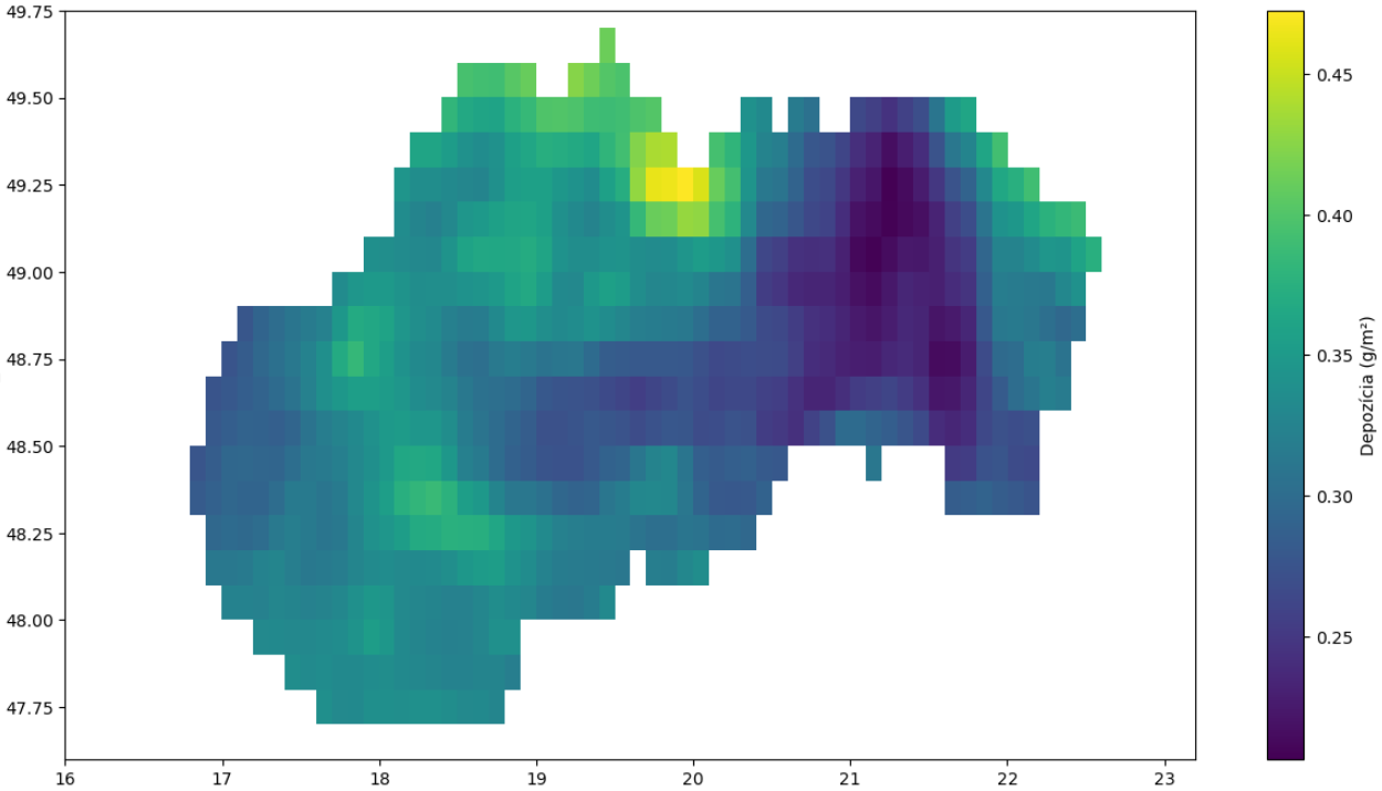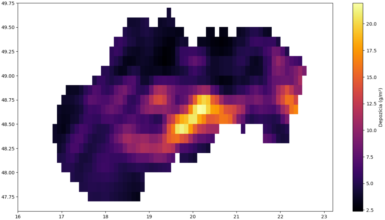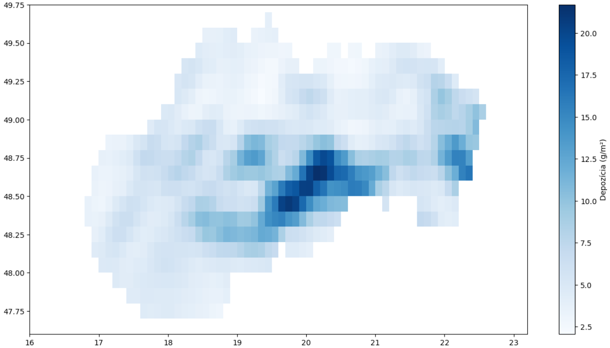 Na nižšie uvedených troch obrázkoch sa nachádzajú prehľadné mapy znázorňujúce suchú, mokrú a celkovú depozíciu saharského prachu v roku 2024. V prípade suchej depozície dosiahla ročná suma pre územie Slovenska približne 15-tisíc ton. Na obr. 1 môžeme vidieť, že maximum sa vyskytuje v oblasti Tatier a dosahuje hodnotu cca 0,5 g/m2. Mokrá depozícia (vplyvom zrážok) v roku 2024 je znázornená na obr. 2. Táto zložka depozície je dominantná a tvorila 95 % z celkovej ročnej depozície. Jej suma v prípade celého územia Slovenska dosiahla približne 316-tisíc ton. Najviac prachu sa k nám logicky dostáva pri južnom prúdení, preto sa maximálne hodnoty zaznamenali na južných náveterných stranách pohorí stredného Slovenska. Absolútne maximum dosiahlo úroveň 21,7 g/m2.