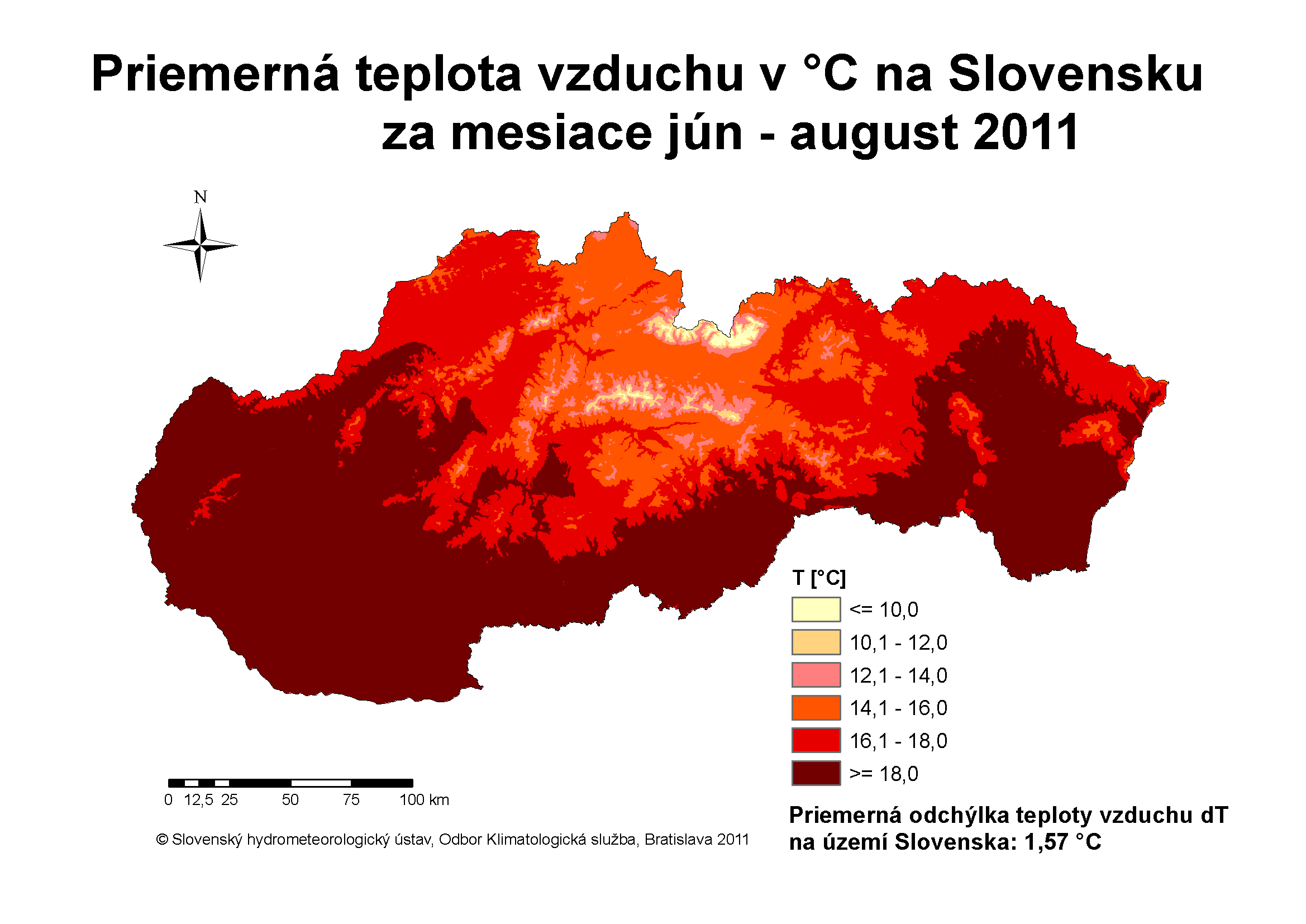 Tabuľka teplotných odchýlok (dT °C) jednotlivých mesiacov leta od normálu (1961-1990) na vybraných meteorologických staniciach na území Slovenska:
