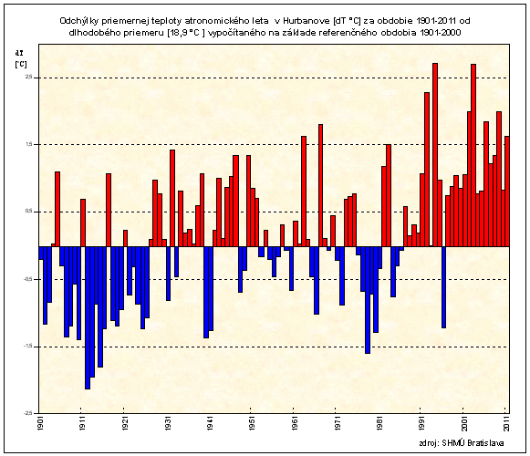 Teplotný charakter konkrétneho leta sa určuje na základe teplotnej odchýlky od akceptovaného dlhodobého priemeru alebo normálu. Čím je rad dlhší, tým je daná hodnota reprezentatívnejšia. V Hurbanove sa pozoruje počasie od roku 1871, teda môžeme vyrátať aj storočný priemer 1901-2000. Priemerná teplota meteorologického leta na základe takto definovaného referenčného obdobia je