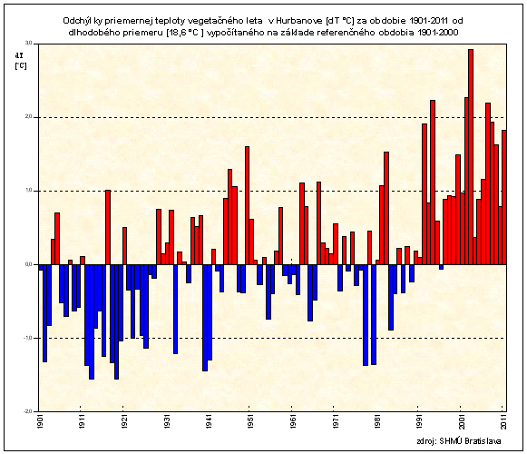 Pre Hurbanovo boli na základe dlhodobého pozorovania 1901-2000 stanovené spomínané intervaly odchýlok. Podľa nich môžeme hodnotiť teplotný charakter leta takto: