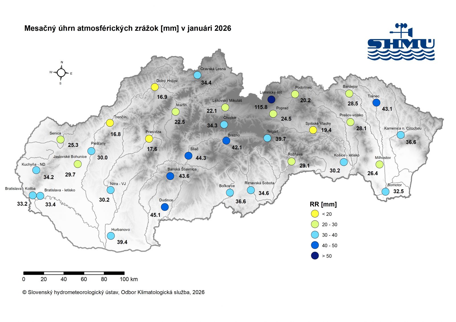 Január 2026 bol na väčšine územia Slovenska zrážkovo silne podnormálny (veľmi suchý) až normálny. Percento normálu 1991 - 2020 mesačného úhrnu zrážok bolo najvyššie 129,7 % v Prešove a najnižšie 34,7 % v Oravskej Lesnej. Najnižší mesačný úhrn zrážok bol nameraný v Gánovciach 15,9 mm. Nízky úhrn zrážok bol aj na staniciach Beluša 16,4 mm, Trenčín 16,8 mm, Dolný Hričov 16,9 mm, Prievidza 17,6 mm, Ihľany-Majerka 17,7 mm, Ružomberok 18,2 mm, Horné Srnie 18,9 mm, Lokca 19,1 mm, Žilina 19,2 mm, Rajecké Teplice 19,3 mm, Spišské Vlachy a Vrbovce 19,4 mm, Holíč 19,8 mm, Skalica a Košecké Podhradie 20,0 mm.