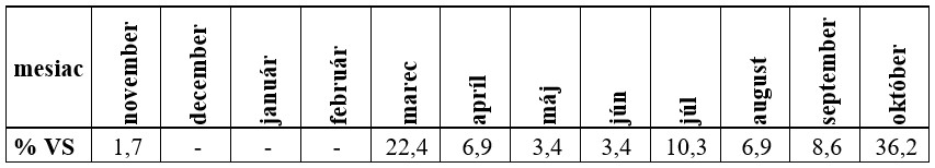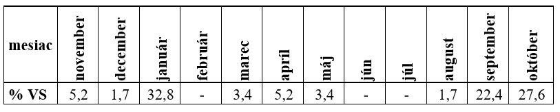 Kulminačné prietoky sa najčastejšie vyskytovali v marci (22,4 %) a v októbri (36,2 %) (Tab. 8).