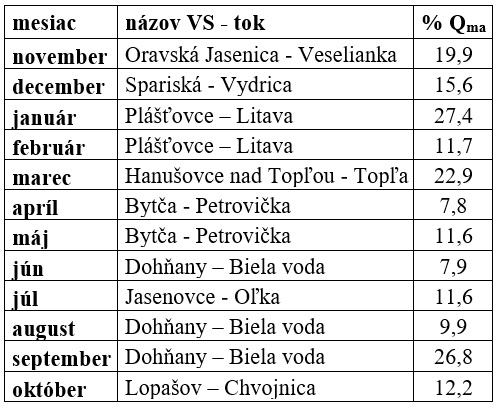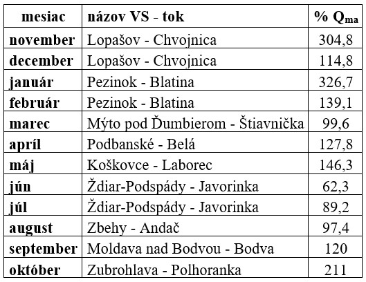 V Tab. 3 uvádzame maximálne relatívne hodnoty priemerných mesačných prietokov (Qm/Qma (%)) v jednotlivých mesiacoch hydrologického roka 2025 spolu s názvom VS a toku, kde bol dosiahnutý. Ako vidieť z tabuľky, najčastejšie boli maximálne relatívne hodnoty priemerných mesačných prietokov dosiahnuté v hodnotených staniciach v povodí Váhu (Tab. 3).