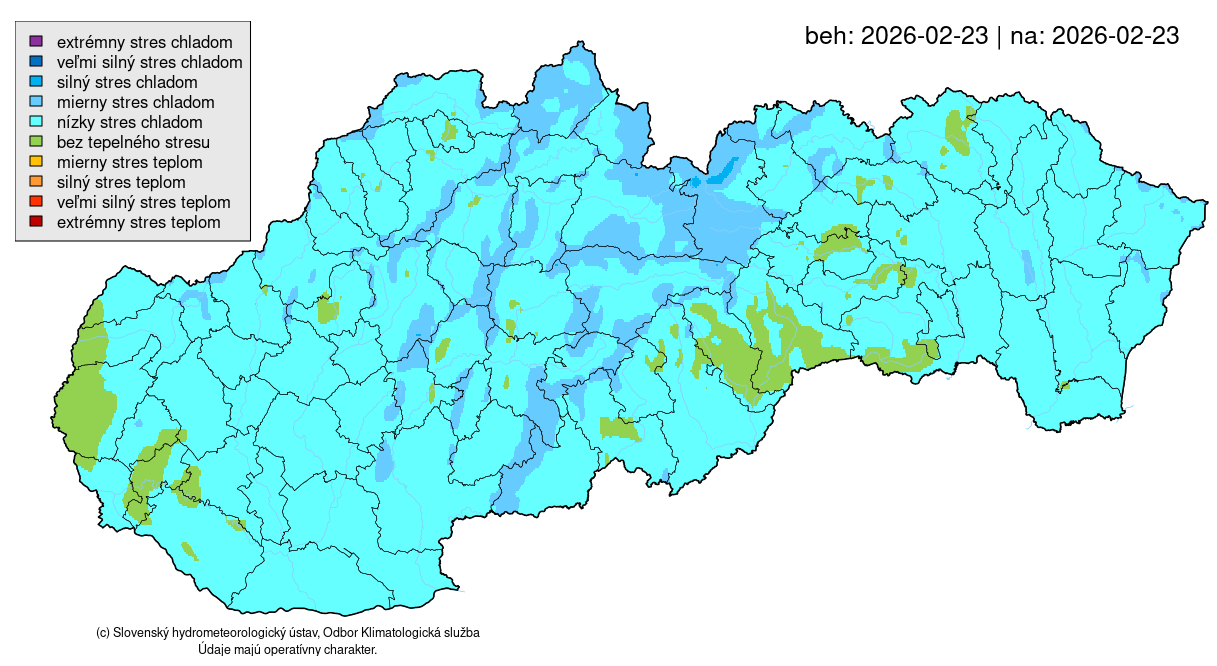 V prípade bioklimatologických indikátorov sú na výber tri nové produkty: Univerzálny tepelný-klimatický index (Universal Thermal Climate Index - UTCI), Tepelný index (Heat Index – HI) a mapa výskytu dusných dní. Index UTCI (Obr. 2 vľavo) prepája fyzikálne údaje o počasí s reakciou ľudského tela, vďaka čomu vyjadruje, akú tepelnú záťaž pociťuje človek v daných poveternostných podmienkach. Tepelný index (Obr. 2 vpravo) znázorňuje akú tepelnú záťaž človek cíti, keď sa skombinuje teplota vzduchu a vlhkosť vzduchu. Tento index je o niečo jednoduchším ako UTCI, nakoľko zohľadňuje menej parametrov vplývajúcich na tepelný komfort človeka. Dusno vyjadruje vlhkostnú záťaž a „ťažkosť“ ovzdušia, nie priamo pocitovú teplotu ako HI, alebo UTCI. Kritérium je založené na množstve vodnej pary v ovzduší a nezohľadňuje napr. vietor či priame slnečné žiarenie, ktoré môžu pocitové vnímanie zhoršiť alebo zlepšiť. Mapy nájdete denne aktualizované na stránke https://www.shmu.sk/sk/?page=1&id=klimat_bio.