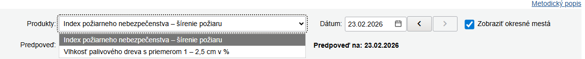 Nové produkty sa nachádzajú v sekcii Klimatologické spravodajstvo – mapové produkty, v záložkách „Index požiarneho nebezpečenstva“ a „Bioklimatologické produkty“. Podobne ako pri doteraz publikovaných mapách je v hornej časti na výber panel s konkrétnym produktom a na pravej strane je možné zvoliť dátum (Obr. 3). To je možné buď kliknutím na dátum, kedy sa rozbalí kalendár, z ktorého si užívateľ môže vybrať konkrétny dátum, alebo klikaním na šípky vľavo a vpravo, kedy je možné posúvať dátum po dňoch dozadu alebo dopredu.