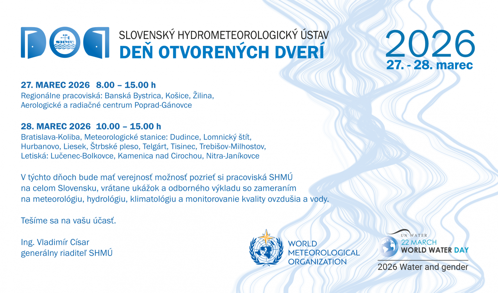 Pozývame vás na Deň otvorených dverí 2026. Uskutoční sa v piatok 27. marca na regionálnych pracoviskách v Banskej Bystrici, v Košiciach, v Žiline a na Aerologicko-radiačnom centre Poprad-Gánovce a v sobotu 28. marca v Bratislave a na meteorologických staniciach: Dudince, Hurbanovo, Lomnický štít, Liesek, Štrbské pleso, Telgárt, Tisinec, Trebišov-Milhostov a na letiskách: Lučenec-Bolkovce, Kamenica nad Cirochou, Nitra-Janíkovce, Prievidza.