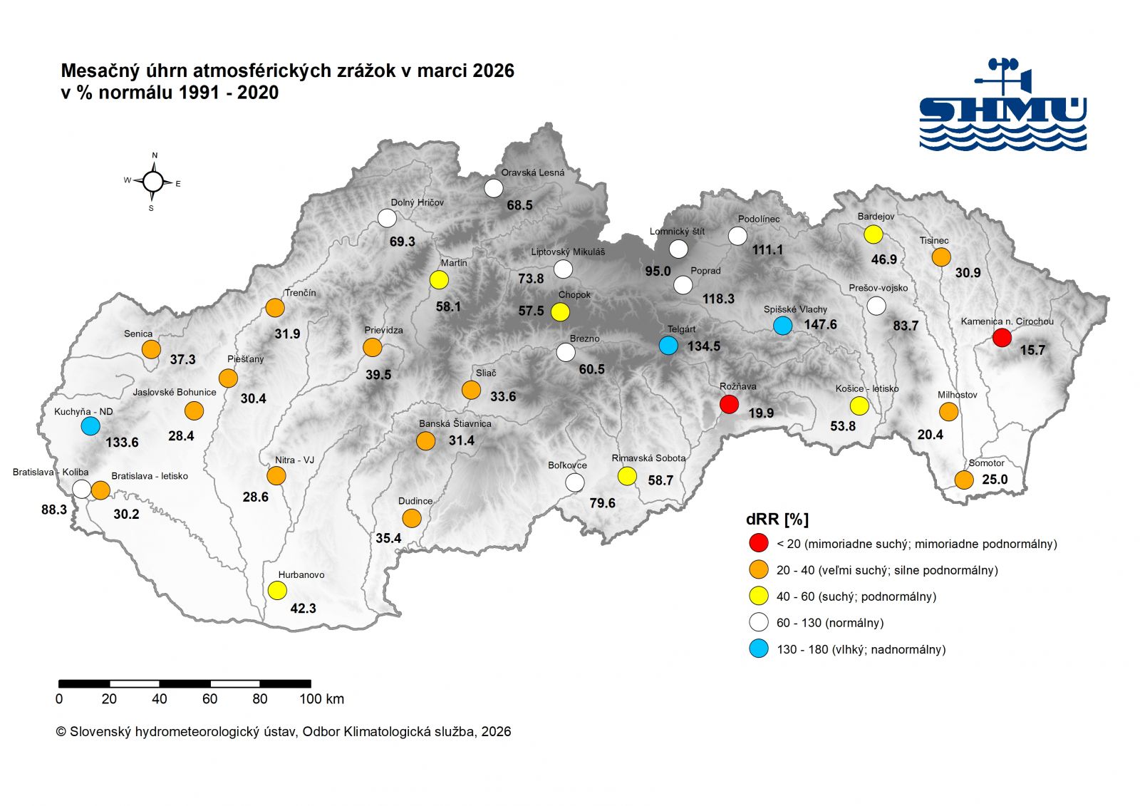 Marec 2026 bol na väčšine územia Slovenska mimoriadne podnormálny (mimoriadne suchý) až silne nadnormálny (veľmi vlhký). Percento normálu 1991 - 2020 mesačného úhrnu zrážok bolo najvyššie 203,3 % v Lieseku a najnižšie 3,9 % v Orechovej.