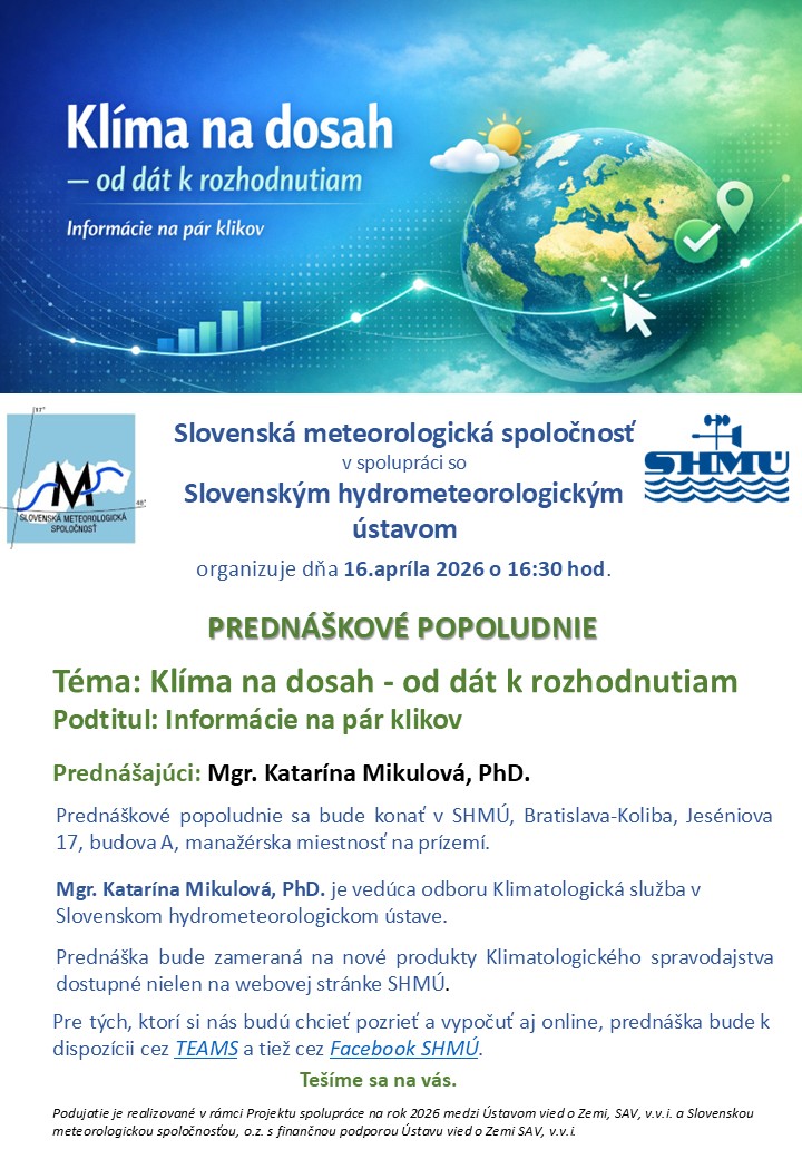 Pozývame vás na Prednáškové popoludnie na tému Klíma na dosah. Uskutoční sa vo štvrtok, 16. apríla 2026 o 16.30 hod. Prednášajúcou bude klimatologička Katarína Mikulová. Podujatie sa bude konať v budove SHMÚ, Bratislava-Koliba, Jeséniova17, budova A, manažérska miestnosť na prízemí, ale budeme ho vysielať naživo na našej facebookovej stránke https://www.facebook.com/shmu.sk.