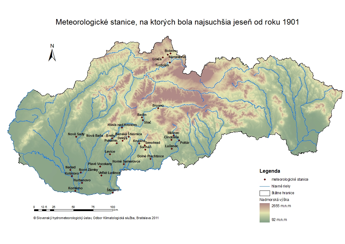 Obr. 1 Mapa staníc, na ktorých bola najsuchšia jeseň od roku 1901 (autorka: Júlia Košťálová)
