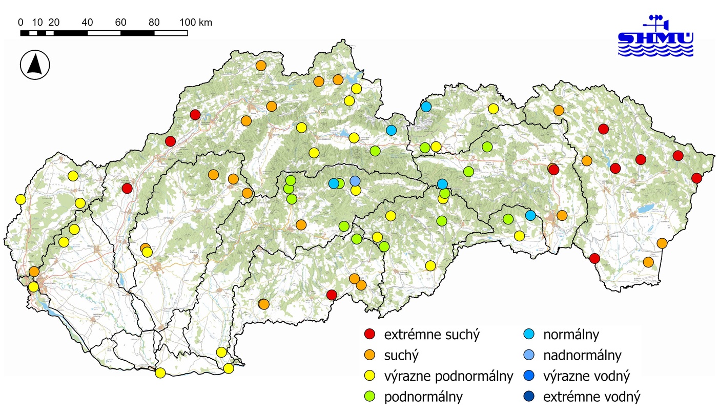 Hodnoty priemerných mesačných prietokov (Qm) spadajúce do kategórie normálneho mesiaca (80 – 120 % Qma,1961-2000) boli dosiahnuté len ojedinele vo vodomerných staniciach (VS) v povodí horného Váhu, Hrona, Dunajca a Popradu, Hornádu a Bodvy. Vo väčšine VS v povodí Moravy, Dunaja, Hrona, Slanej, Bodvy a Hornádu prevládali hodnoty priemerných mesačných prietokov kategórií podnormálneho až výrazne podnormálneho mesiaca (40 - 80 % Qma,1961-2000). Hodnoty Qm kategórií suchého a extrémne suchého mesiaca prevládali vo VS v subpovodí Nitry, v hornej časti povodia Váhu (v oblasti Bielych Karpát, Oravy a Kysuce) a v povodiach Ipľa, Bodrogu a východnej časti povodia Hornádu (Obr. 1).