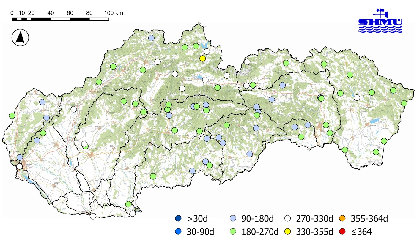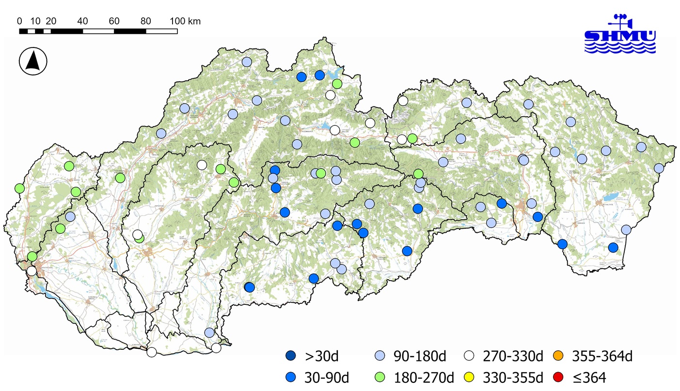 * Poznámka: M-denný prietok predstavuje priemerný denný prietok dosiahnutý alebo prekročený po M dní v zvolenom období. To znamená, že napríklad 355-denný prietok (Q355d) je hodnota, ktorá by v danom profile na toku mala byť menšia v priemere len 10 dní v roku (365 dní mínus 355 dní), po zvyšné dni roka by mala byť buď rovná tejto hodnote alebo väčšia. Za hodnoty blízke minimám (obdobie sucha) považujeme najmä hodnoty odpovedajúce Q355d, Q364d.