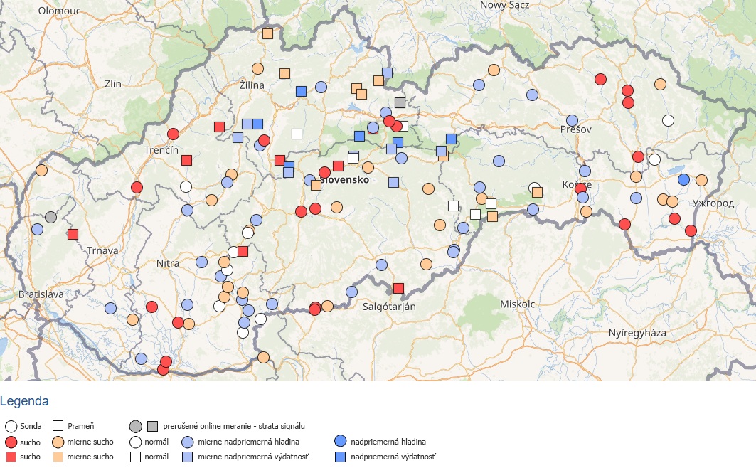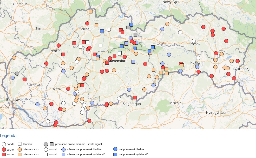 Nadpriemerné teploty vzduchu a dlhšie obdobie s výskytom len minimálnych úhrnov atmosférických zrážok spôsobili postupné zhoršovanie situácie v podzemnej vode. Na začiatku mesiaca marec 2026 bola zaznamenaná najnepriaznivejšia situácia v podzemnej vode v povodí Bodrogu, kde hladina podzemnej vody bola prevažne na úrovni mierneho sucha až sucha (hodnoty rovné a nižšie ako Q40 (1981 – 2010) a Q10 (1981 – 2010)) (Obr. 6). Naopak, nadpriemerný stav bol zaznamenaný v povodí Dunajca a Popradu, Hornádu a Moravy.