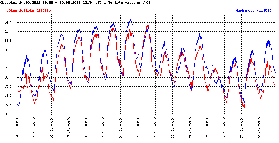 Chod teploty vzduchu v 2 m nad zemským povrchom (Hurbanovo a Košice) z automatickej meteorologickej stanice: