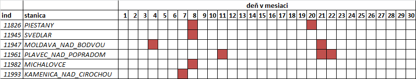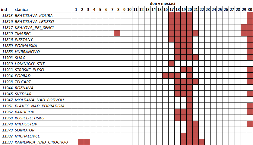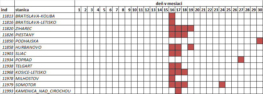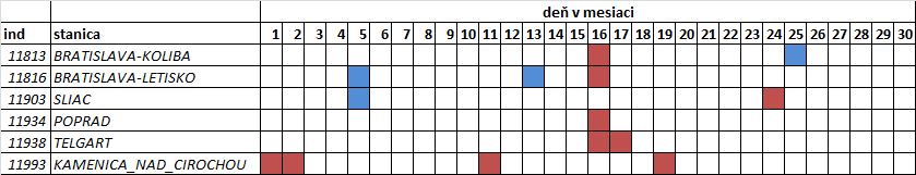 V nasledujúcich tabuľkách sú vyznačené dni kedy bol prekonaný rekord (pozri legendu a mapu staníc).