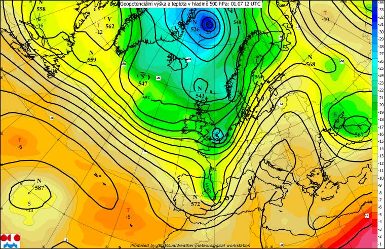 Geopotenciálna výška a teplota vzduchu v hladine 500 hPa (vľavo) a 850 hPa (vpravo) zo dňa 1.7.2012: