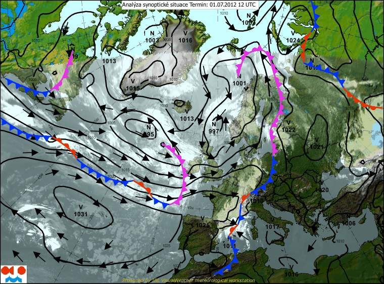 Synoptická situácia (vľavo) a Počasie a teplota vzduchu (vpravo) zo dňa 1.7.2012: