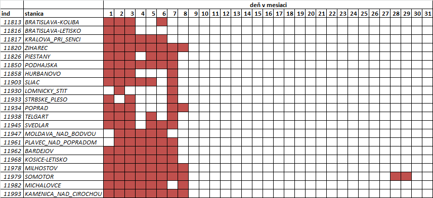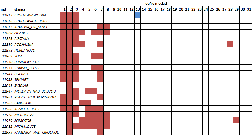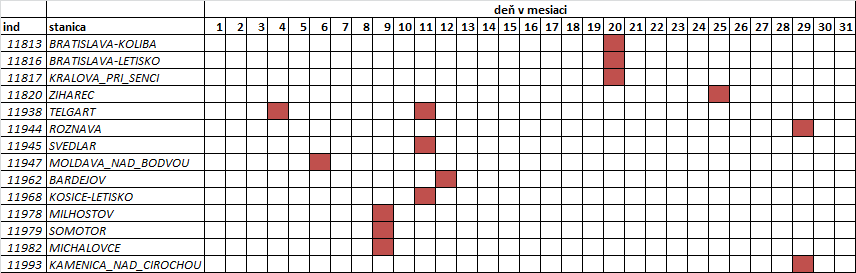 V nasledujúcich tabuľkách sú vyznačené dni kedy bol prekonaný rekord (pozri legendu a mapu staníc).