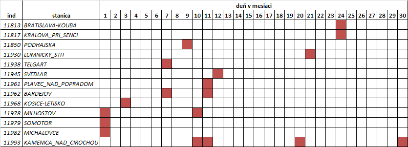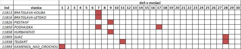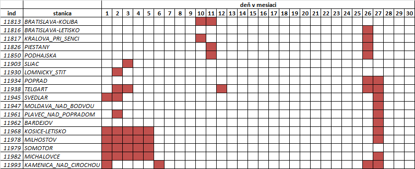 V nasledujúcich tabuľkách sú vyznačené dni kedy bol prekonaný rekord (pozri legendu a mapu staníc nižšie).