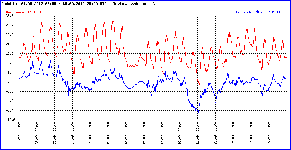 Priebeh teploty vzduchu v septembri 2012 zaznamenaný automatickou meteorologickou stanicou (Hurbanovo a Lomnický štít):