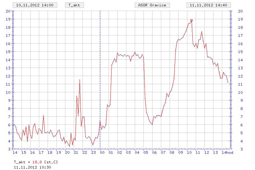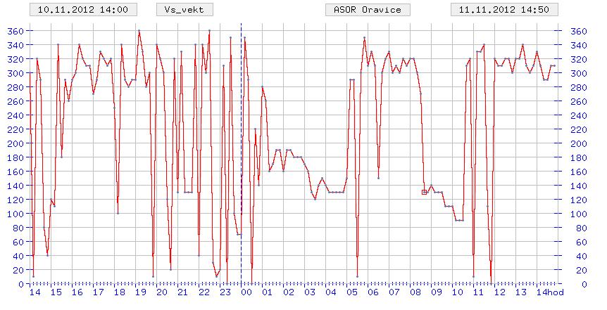 Obr.1: Priebeh teploty vzduchu, relatívnej vlhkosti vzduchu, smeru a rýchlosti vetra v Oraviciach dňa 11.11.2012