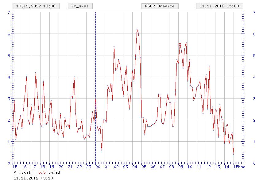okolo 8 m/s (30 km/h) a tu v nárazoch miestami okolo 15 m/s (55 km/h).