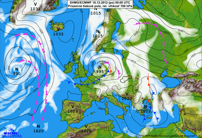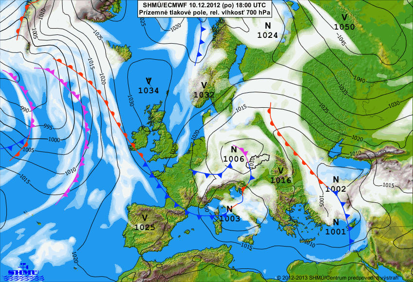 Prízemné tlakové pole, relatívna vlhkosť v 700 hPa 10.12.2012 o 00:00 UTC a 10.12.2012 o 18:00 UTC: