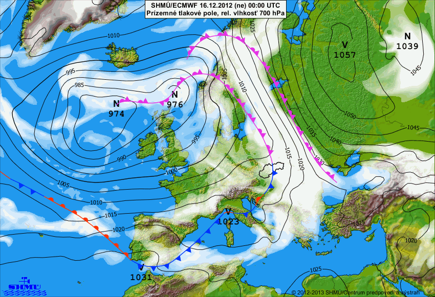 Prízemné tlakové pole, relatívna vlhkosť v 700 hPa, 15.12.18:00 UTC a 16.12.2012. o 00:00 UTC: