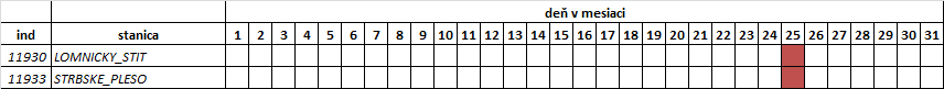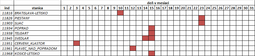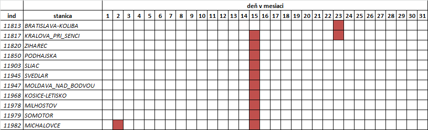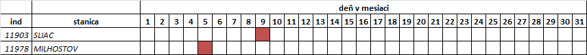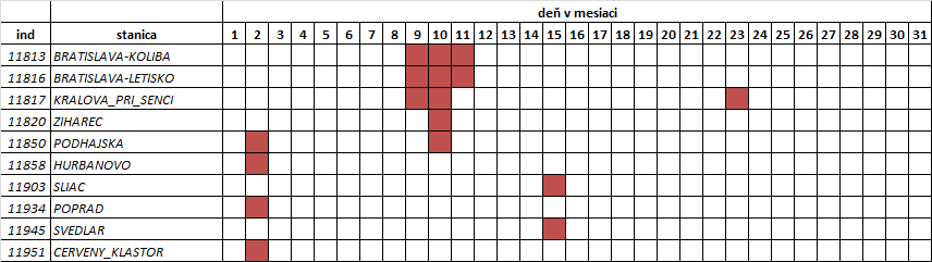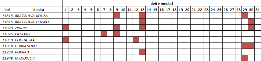 V tabuľke uvádzame len tie dni, kedy bol prekonaný denný rekord spomenutej veličiny (meteorologického prvku, resp. klimatologickej charakteristiky). Pre operatívnosť poskytnutia informácie sú údaje porovnávané len z obdobia, odkedy sú uložené v databáze IS KMIS (resp. IS KOaK). Taktiež je zohľadnená kompletnosť (neprerušený rad) pozorovaného obdobia. Preto stanice s kratším časovým radom pozorovania alebo rady s prerušením nie sú do hodnotenia zaradené (pozri: Sieť vybraných klimatologických staníc a obdobie... nižšie).