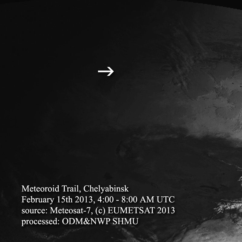 Kondenzačnú čiaru po meteorite, ktorý dnes ráno dopadol do obývanej oblasti v Rusku, zachytila aj meteorologická geostacionárna družica Meteosat-7. Ponúkame vám animáciu satelitných záberov s 30-minútovým krokom. Šípka označuje oblasť jeho preletu atmosférou. (Poznámka pre znalcov - na týchto snímkach kvôli nízkemu rozlíšeniu vlastne nie je zreteľná samotná kondenzačná čiara, ale jej tieň vrhaný na zemský povrch.)