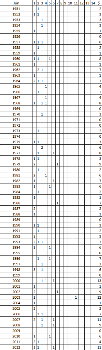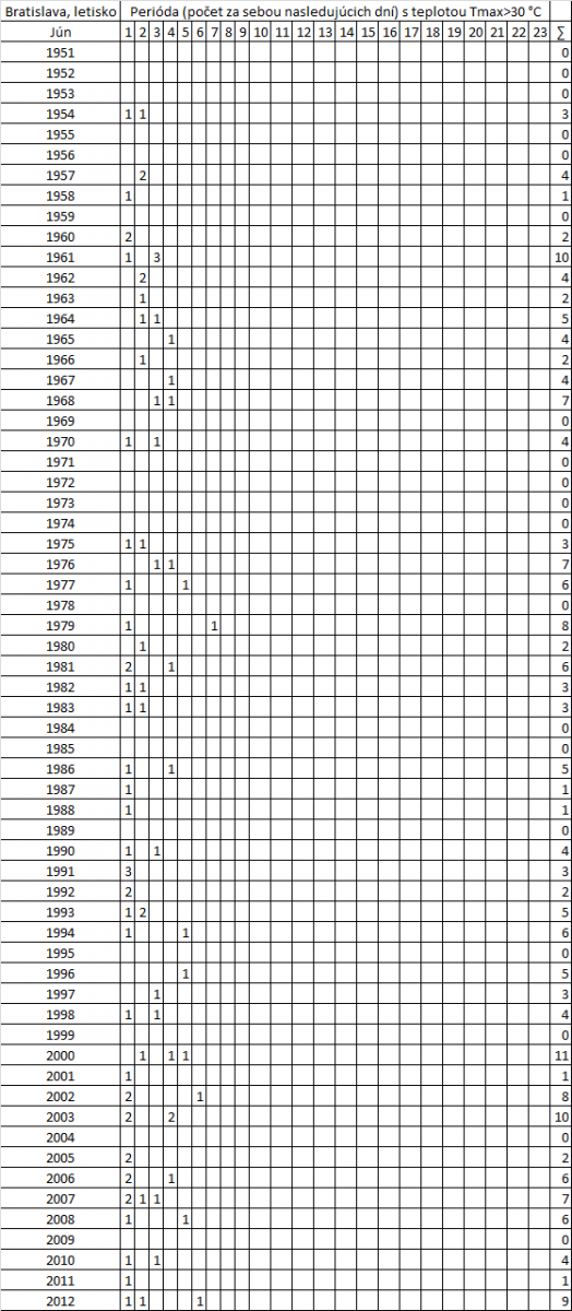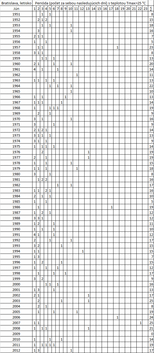 Keďže i menší počet „horúcich“ dní môže spôsobiť zdravotné problémy spracovali sme všetky dni, teda od 1 až po najdlhšie súvislé obdobie (po sebe nasledujúcich dní) charakteristických teplôt pre metropolu Slovenska, Bratislavu za obdobie digitalizovaných údajov uložených v databáze (1951-2012).