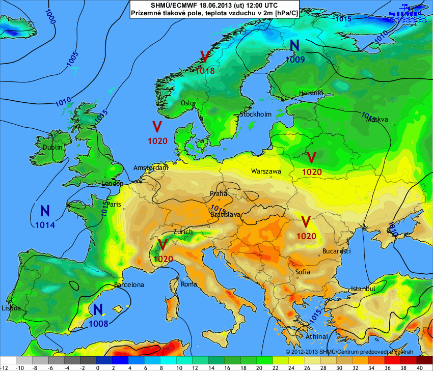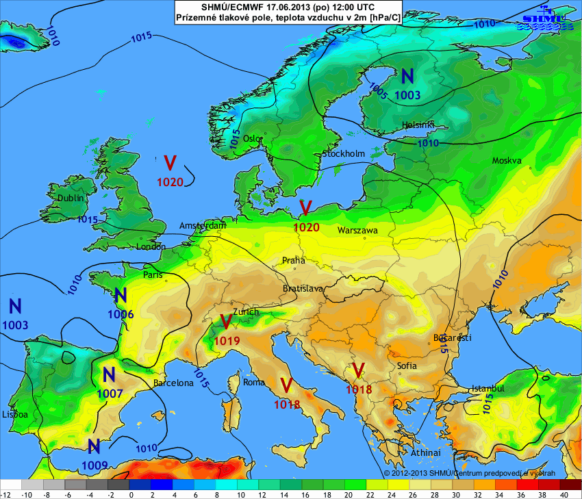 Prízemné tlakové pole a teplota v 2 m nad zemským povrchom 17.6. a 18.6.2013 o 12:00 h: