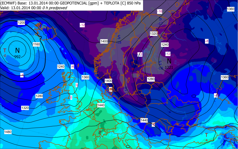 Na obrázku dolu, ktorý znázorňuje analýzu teploty v hladine 850 hPa (približne 1500 m nad morom) o 01:00 hod. dnes 13.12., je vidno že veľmi studený vzduch sa dostal až do severného Poľska (-13 stupňov v hladine 850 hPa), čiže len pár stoviek km na sever od Slovenska.