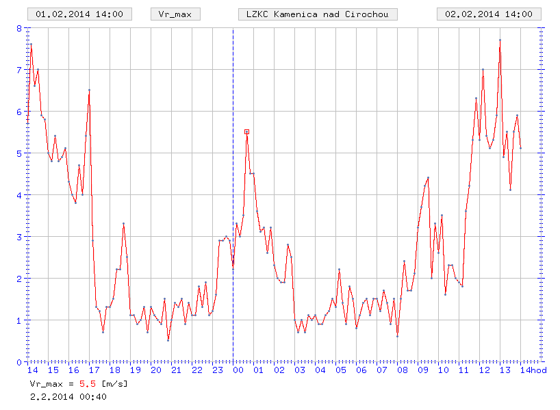 Obr. 2c - Priebeh maximálnych nárazov vetra z automatickej stanice Oravice.