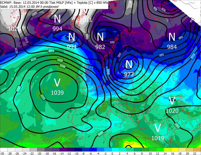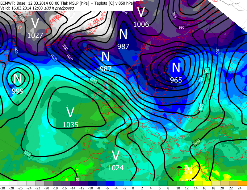 Na rozdiel od počasia cez pracovný týždeň, ktoré prebiehalo pod taktovkou mohutnej tlakovej výše a vyznačovalo sa veľmi stabilným charakterom, cez víkend dôjde k významnej zmene. Stred tlakovej výše sa presunie smerom nad Atlantik s výbežkom smerujúcim k Islandu. Na jej prednej strane sa vytvorí veľmi silné dýzové prúdenie vo vyšších hladinách troposféry (s rýchlosťou nad 250 km/h), v rámci ktorého rýchlo postúpi tlaková níž zo Škandinávie smerom nad Pobaltie. S ňou spojený studený front začne Slovenskom prechádzať v poludňajších hodinách v sobotu (obr. 1) a predpokladá sa, že do večera prejde celým našim územím. Za ním k nám prenikne chladnejší vzduch. Na fronte sa vyskytnú prehánky alebo občasný dážď, nie je vylúčený ani ojedinelý výskyt búrky. Na fronte a za ním bude lokálne veľmi veterno - v exponovaných polohách s nárazmi vetra nad 20 m/s.