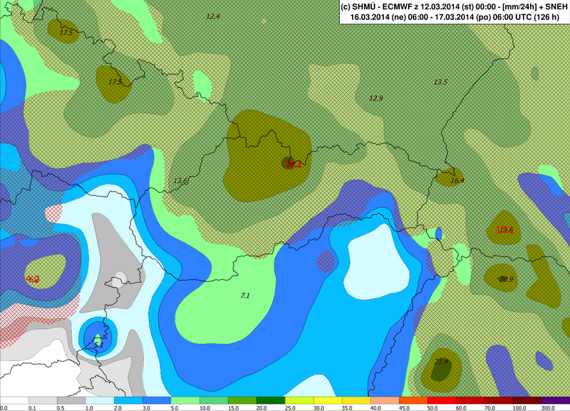 Obr. 4 Simulovaný 24-hodinový úhrn zrážok medzi nedeľou 16.3.2014 06 UTC (07 SEČ) a pondelkom 17.3.2014 06 UTC (07) SEČ podľa modelu ECMWF. Šrafovaná plocha predstavuje predpoklad modelu, že určitá časť zrážok vypadne vo forme snehu.
