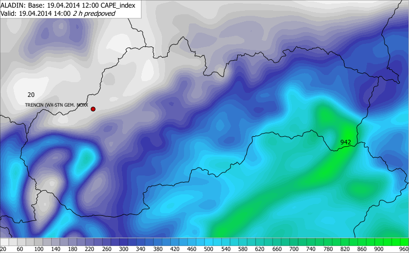 Slovensko sa v daný deň nachádzalo na rozhraní dvoch tlakových útvarov – tlakovej výše nad severnou Európou a tlakovej níže so stredom nad maďarsko – rumunským pohraničím (obr. 1 - biele izočiary). Medzi nimi k nám cez deň od východu prešlo nevýrazné frontálne rozhranie. Zároveň vo vyšších hladinách troposféry postupovala z Rumunska nad Maďarsko tlaková níž (obr. 1 - farebná škála), ktorá ovplyvnila dianie v počasí aj u nás. Kombinácia relatívne teplého a vlhkého vzduchu v nižších hladinách, spolu s klesajúcou teplotou v stredných hladinách troposféry za frontálnym rozhraním, prispela ku vzniku vhodných podmienok na vývoj hlbokej konvekcie. Model ALADIN nasimuloval najvýraznejšiu labilitu ovzdušia (najvyššie hodnoty CAPE) nad juhovýchod územia.