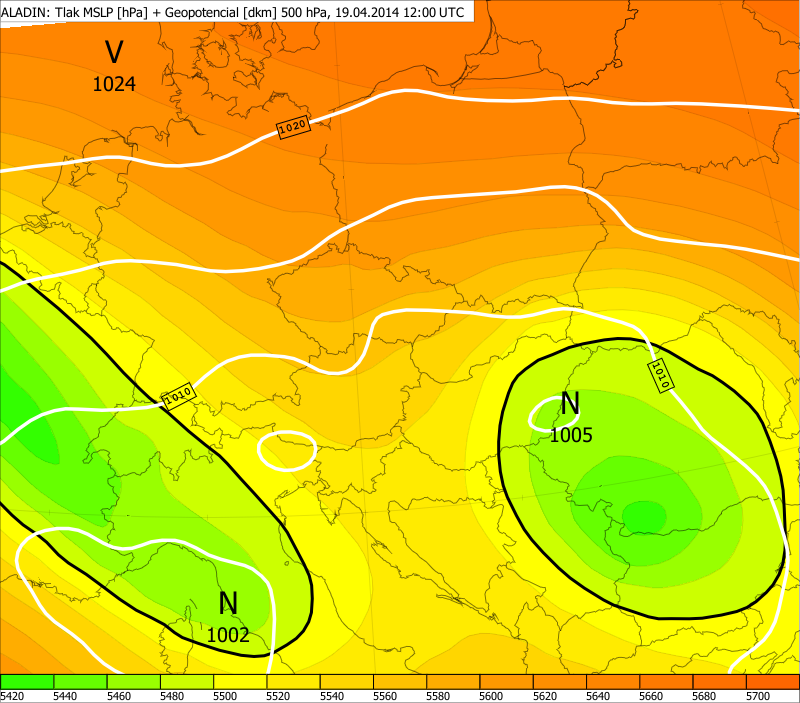 Obr. 1 - Analýza modelu ALADIN prízemného tlakového poľa (biele izočiary) a geopotenciálu hladiny 500 hPa (farebná škála) 19.4.2014 12:00 UTC.