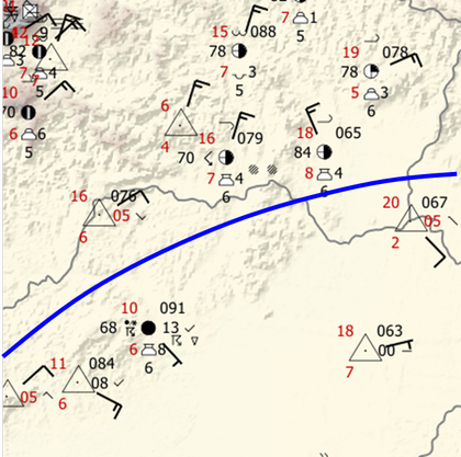 Obr. 2a - SYNOP 19.4.2014 13:00 UTC a čiara konvergencie (v tomto prípade frontu).              Obr. 2b - SYNOP 19.4.2014 14:00 UTC a čiara konvergencie.