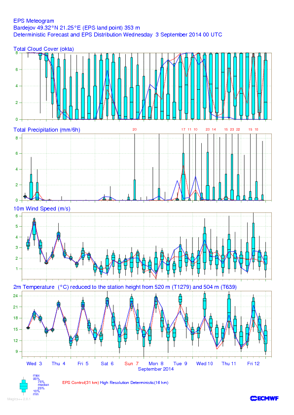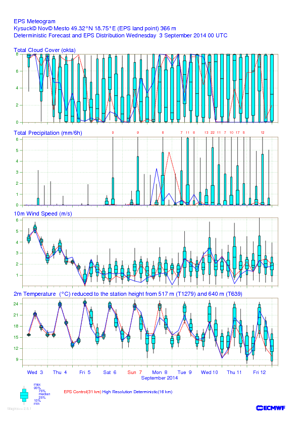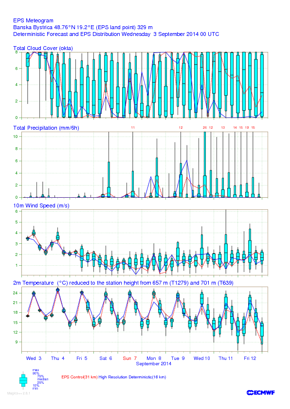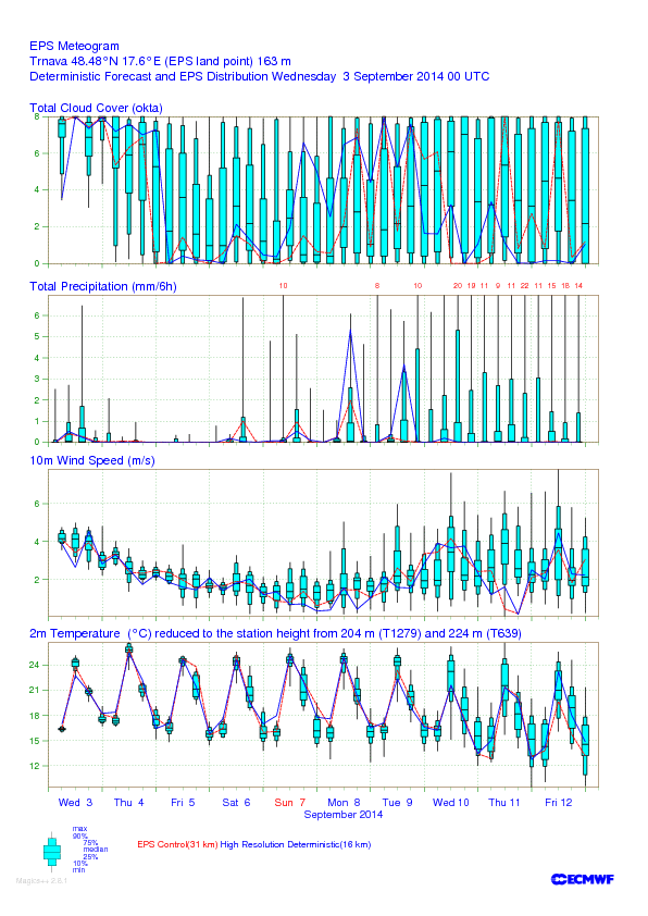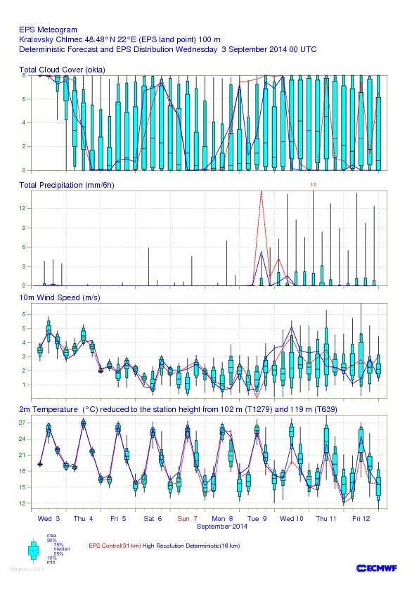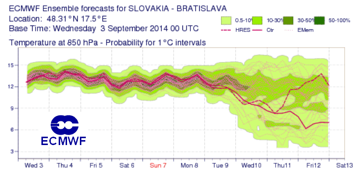 Teplejší a na zrážky chudobnejší charakter počasia vidieť aj z ansamblových (pravdepodobnostných) behov modelu ECMWF, pozrite si bodovú predpoveď pre vybrané lokality: Trnava, Banská Bystrica, Kysucké Nové Mesto, Bardejov, Kráľovský Chlmec. Očakávaný ustálený a teplejší charakter počasia dokazuje aj ansamblová predpoveď teploty vzduchu v hladine 850 hPa (výška cca 1500 m). Zmenu badať najskôr v stredu v budúcom týždni, vzhľadom na vysokú neurčitosť však zatiaľ nie je zrejmé, kedy k nej dôjde.