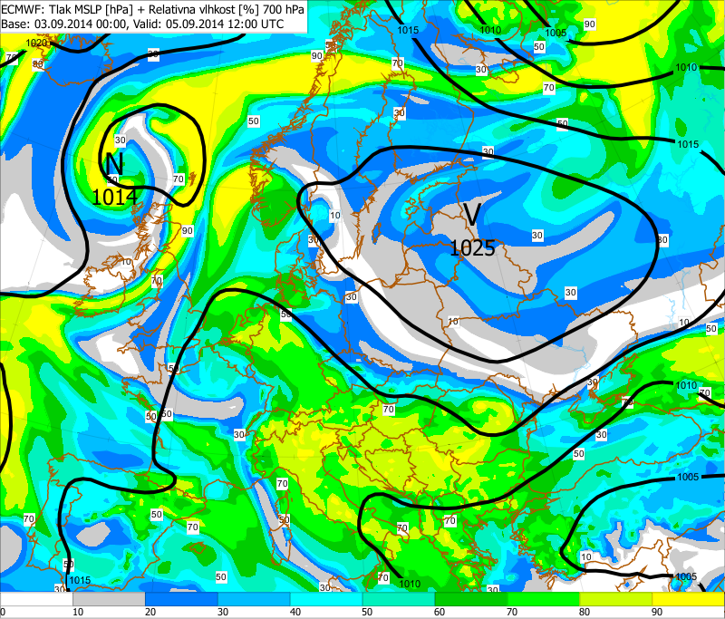 Predpoveď modelu ECMWF prízemného tlakového poľa (čierne izočiary) a relatívnej vlhkosti v hladine 700 hPa (farebná škála) na 5.9.2014 12:00 UTC.