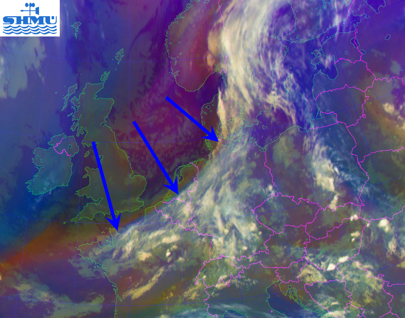 Obr. 1 - Snímka z družice MSG, Airmass, 21.9.2014 06:00 UTC, šípky ukazujú studený front.