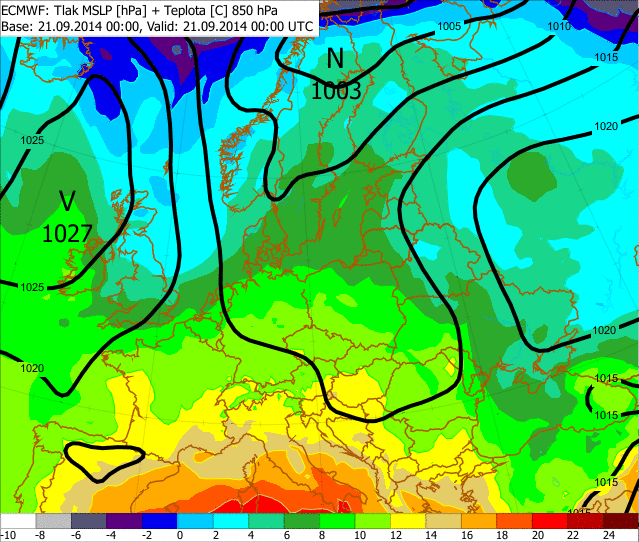 Zmenu v počasí prinesie studený front, ktorý sa dnes ráno nachádzal na západnom pobreží Európy (obr. 1). Cez naše územie prejde v priebehu pondelka 22.9.2014. Po jeho prechode k nám po zadnej strane tlakovej níže so stredom nad Pobaltím (neskôr nad východnou Európou) bude od severu prúdiť studený vzduch (obr. 2). Pozrite si aj animáciu tlakového poľa a teploty vzduchu v hladine 850 hPa, kde vidieť prechod frontu cez strednú Európu.