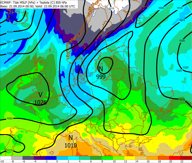 Obr. 2 - Predpoveď modelu ECMWF prízemného tlakového poľa (čierne izočiary) a teploty v hladine 850 hPa (farebná škála) na 22.9.2014 06:00 UTC. Studený front prechádza Slovenskom.