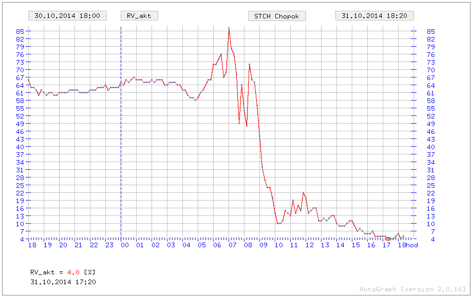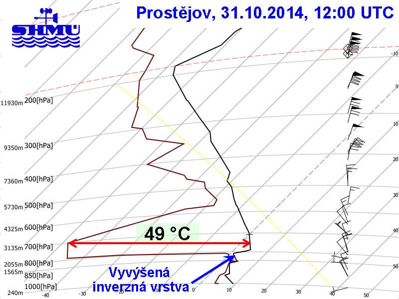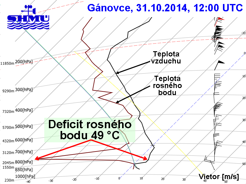 Na obr. 2 je zobrazené aerologické meranie z Gánoviec o 12:00 UTC. Pri porovnaní priebehu teploty vzduchu a teploty rosného bodu je zjavné, že najsuchšia vrstva sa nachádzala v nadmorskej výške okolo 2200 m. Deficit teploty rosného bodu dosiahol až 49 °C! Išlo tak o mimoriadne suchý vzduch s relatívnou vlhkosťou len 1 % a s obsahom vodnej pary 0.075 g/kg (pre porovnanie, v nižších polohách bolo okolo 5 g/kg). Na profile vetra je tiež vidieť, že tento suchý vzduch sa nad naše územie dostal od západu (len v tejto vrstve fúkal západný vietor, v ostatných hladinách severný). V nižších polohách však bol vzduch vlhký, dokonca až nasýtený, v polohách do cca 1300-1400 m sa vyskytovala nízka oblačnosť a hmly (na obr. 2 v spodných hladinách sú krivky teploty vzduchu a teploty rosného bodu veľmi blízke a vo výške, kde sa takmer dotýkajú, sa nachádza nízka oblačnosť).