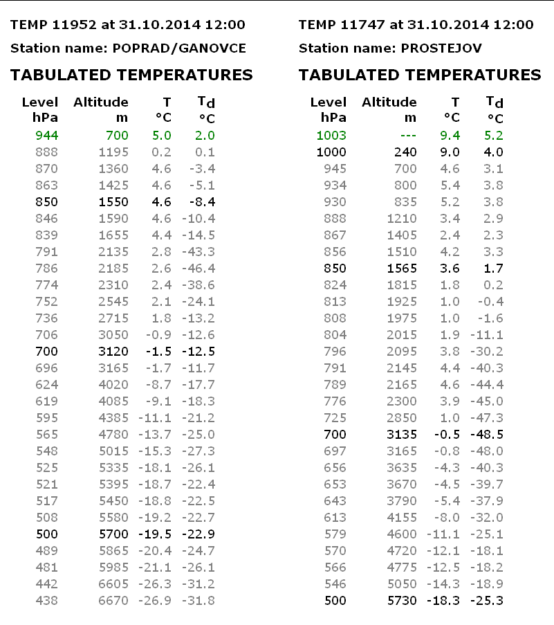 Tab. 1 - Hodnoty teploty vzduchu a teploty rosného bodu v jednotlivých hladinách z aerologických meraní v Gánovciach a v Prostějove.