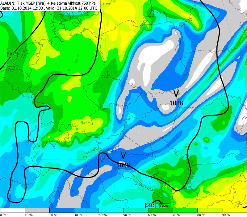 Obr. 1 - Analýza prízemného tlakového poľa a relatívnej vlhkosti v hladine 750 hPa (výška cca 2500 m) modelu ALADIN. Nad Slovenskom suchý vzduch, nad Nemeckom vlhký.