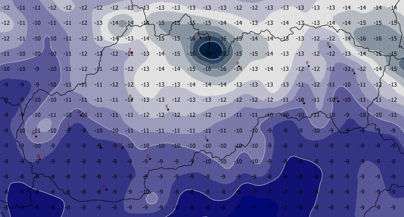 Obr. 3 - Predpoveď minimálnej teploty vzduchu vo výške 2 m nad povrchom podľa modelu ECMWF v noci na stredu 31.12.2014. Pri málooblačnej oblohe a snehovej pokrývke môže teplota v noci klesnúť ešte nižšie ako predpokladá model!